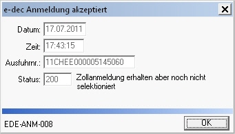 Die Anmeldung wird via Internet zum Server der Oberzolldirektion gesendet. Dieser prüft die Daten und sendet die Ausfuhrzollanmeldung als PDF-Dokument zurück. Gleichzeitig wird die erteilte Ausfuhrnummer angezeigt. Der ganze Vorgang dauert nur wenige Sekunden.